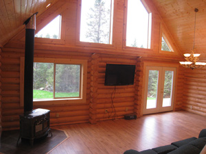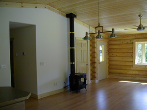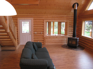 The wood stove & laminate floor accent the log look. The owners have