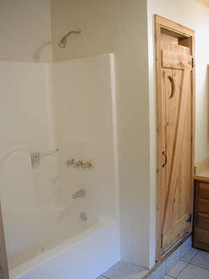 Country style bathroom. Behind outhouse style door